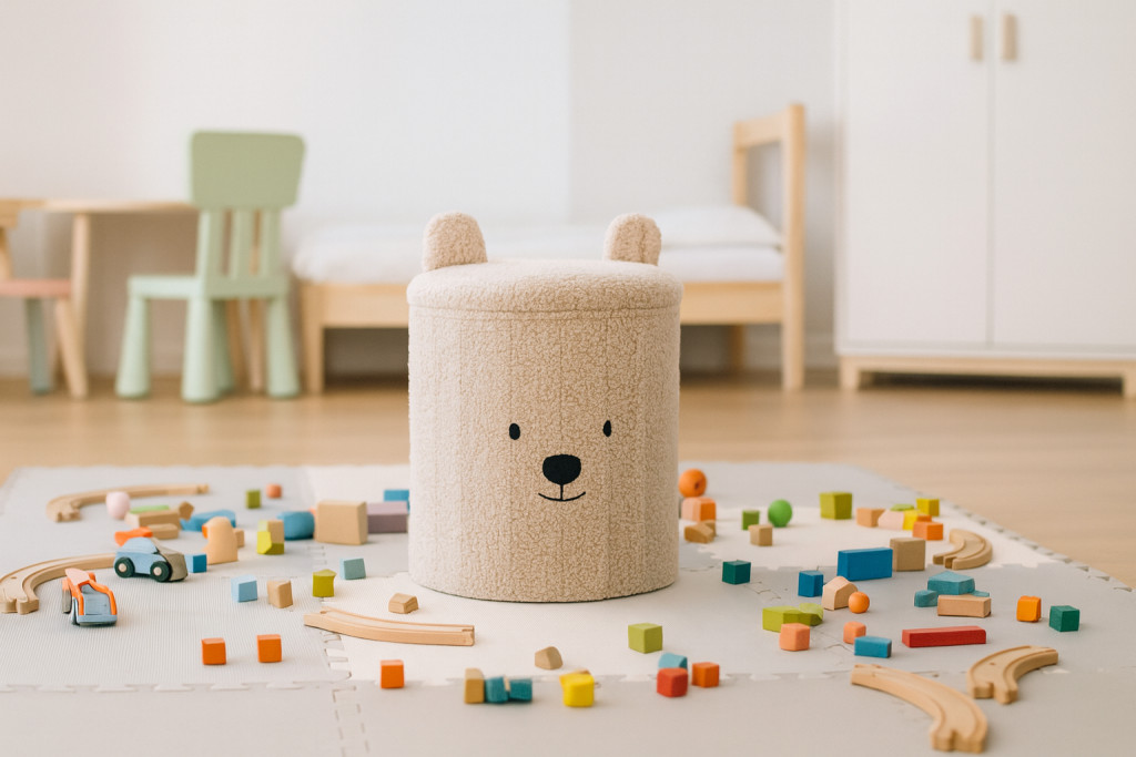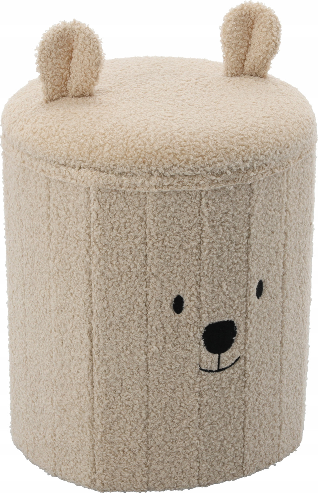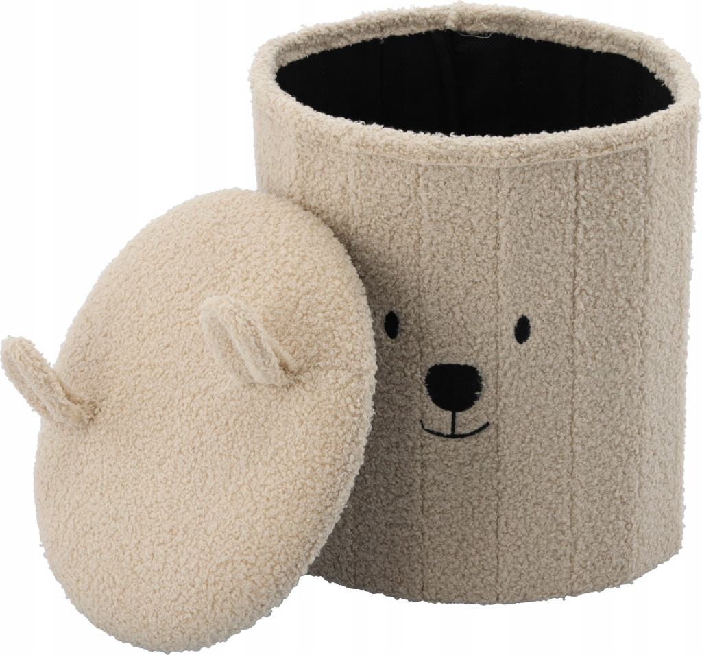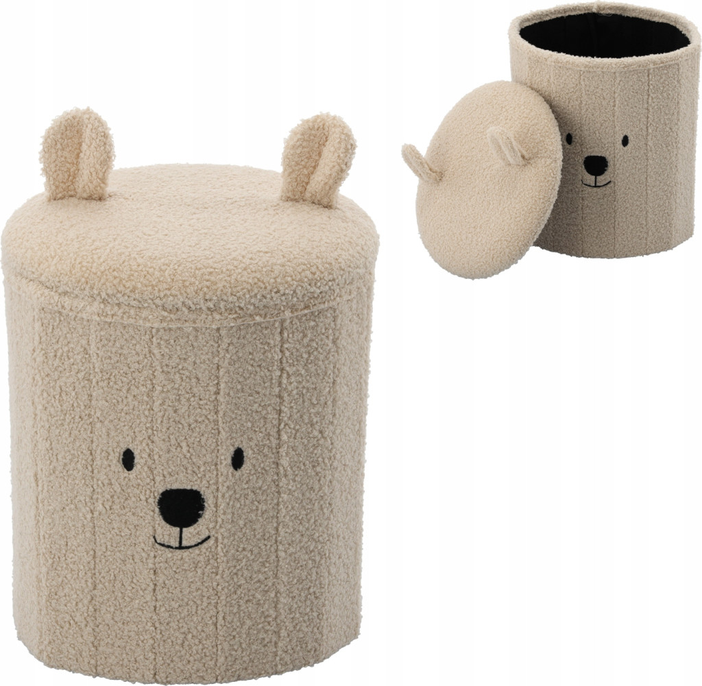 A világosbézs színű, összecsukható mackós tárolópuff praktikus és stílusos kiegészítője lehet bármely belső térnek. Egyesíti az ülőhelyet és a tárolást, biztosítva a rendet, a kényelmet és az esztétikus megjelenést. Tökéletes nappaliba, hálószobába vagy gyerekszobába.